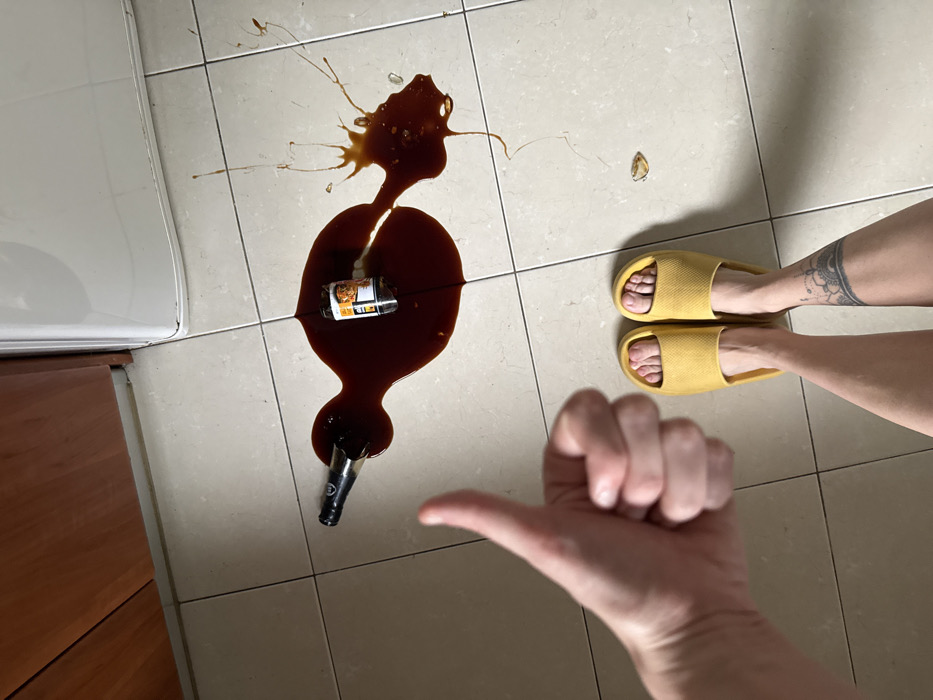 A broken bottle of dark liquid spills on a tiled floor, creating a large, irregular stain. The neck of the bottle points down, with a shattered midsection. Yellow slippers appear in the upper-right corner near a tattoo on an ankle. A hand, giving a thumbs-up, is prominent in the foreground. Part of a cabinet is visible on the left.