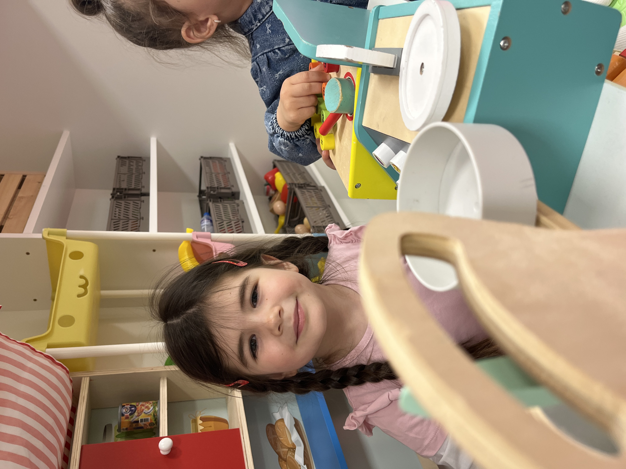 Two young girls are playing in what appears to be a playroom. One girl, wearing a denim jacket, is operating a toy cash register. The other girl, wearing a pink shirt and with her hair in braids, is looking directly at the camera and smiling. The playroom has shelves filled with various toys and storage bins. The location is likely a playroom, but without further information, I can't determine if the location is in the city of Sofia, Bulgaria.
