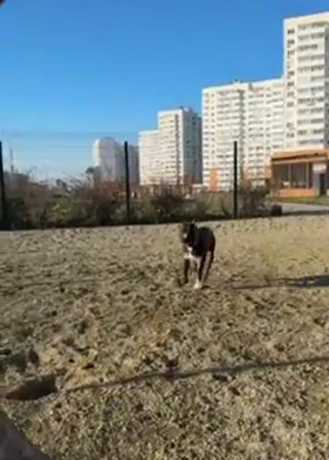 small, black and white dog running toward and through a large metal ring suspended between two posts in a dog park. The dog runs through the center of the ring and continues away from the camera. The ground is covered in gravel and grass. In the background, several large apartment buildings are visible under a clear blue sky. The camera follows the dog.