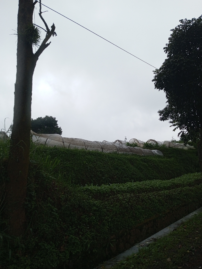 This image depicts an agricultural landscape in YonPhoogla, Bhutan, under a grey, overcast sky. In the left foreground, a tall, dark tree trunk with pruned branches and a cluster of epiphytic plant growth is visible. A thin, dark utility line extends diagonally from the upper left of the frame towards the right. The midground features a steeply sloped, terraced hillside densely covered in various green vegetation. Along the upper tier of this hillside, a series of elongated, tunnel-shaped structures, covered with translucent material, are arranged horizontally. A dense canopy of a large, dark tree is visible on the far right, and another smaller tree appears in the distant background behind the structures. A concrete-lined drainage channel is partially visible along the bottom right edge of the frame. No individuals are present in the scene.