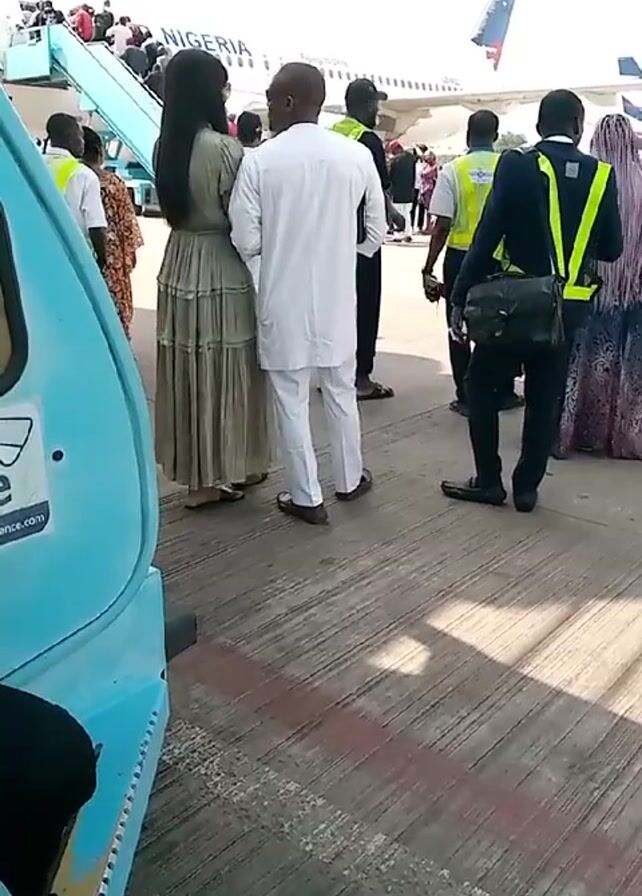 group of people standing on an airport tarmac near an aircraft. The aircraft is labeled "Nigeria" on its fuselage. A set of stairs is attached to the aircraft's door, and passengers are seen disembarking. Among the people on the tarmac are a woman in a long, tiered dress and a man in a white outfit. A person in a black suit with a neon yellow safety vest is standing nearby. Other airport personnel in safety vests are also visible. The setting appears to be a sunny day at an airport.