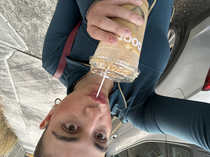 A person in a teal zippered athletic outfit is sipping from a clear plastic cup with a straw. The cup is labeled "GOOD" and appears to contain a coffee beverage with ice. The person has light skin, dark hair pulled back, and is wearing a thin silver necklace. A burgundy purse strap is visible on their shoulder. The background shows concrete pavement, foliage, and the rear of a silver vehicle.