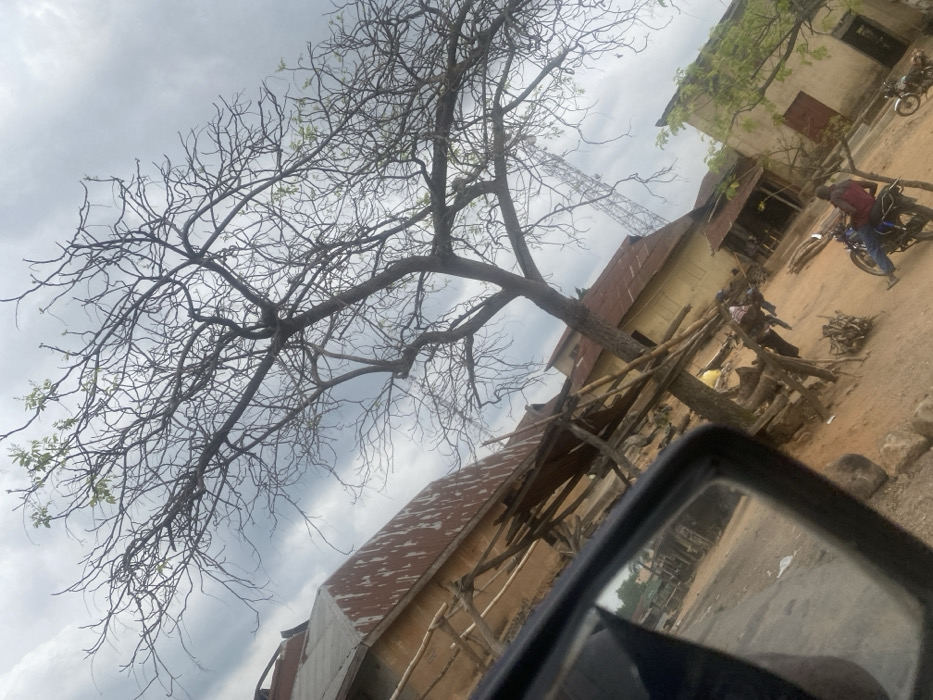 The image displays an outdoor scene in Oba, Nigeria, captured under an overcast sky with extensive grey cloud cover. The foreground on the left features a partial view of a dark vehicle's side mirror, which reflects a blurred street surface. A large tree with numerous bare branches and sporadic clusters of light green leaves at its extremities dominates the central and upper portions of the image. To the left of this tree stands a building constructed with light brown or tan walls and a heavily weathered, rusted corrugated metal roof. Several crude wooden structures, possibly scaffolding or supports, are propped against this building. Further in the mid-ground, additional buildings with similar light-colored walls and corrugated metal roofs are visible. A tall, grey metal lattice telecommunication tower ascends in the background, positioned to the right of the prominent tree. The ground consists of reddish-brown dirt or unpaved earth. In the mid-ground, a dark-colored motorcycle is present with an individual, wearing a dark shirt and light-colored trousers, seated on it and facing left. Multiple indistinct figures are visible standing or moving among the buildings and near the base of the large tree; one figure appears to be wearing a striped garment. Piles of cut wood logs are scattered on the ground near the tree and buildings. A second motorcycle is partially visible, parked further to the right. A yellow object rests on the ground near the base of the large tree.