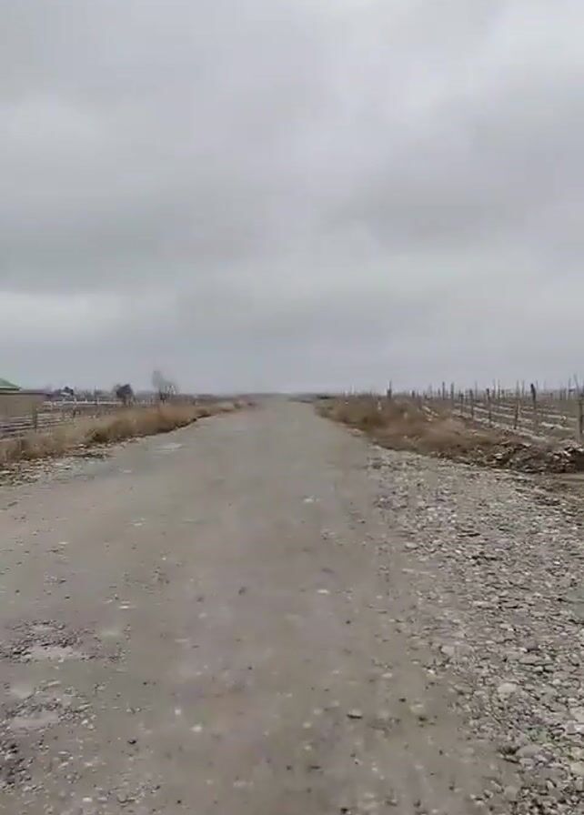 gray gravel road leading away from the camera, with overcast skies above. The road is lined with sparse vegetation and what appear to be rows of poles, possibly supporting a vineyard or other agricultural structure, on the right. On the left, there is a glimpse of a building and some bare trees in the distance. The ground appears damp, suggesting recent rain or moisture. The atmosphere is bleak and the scene appears rural and somewhat desolate.