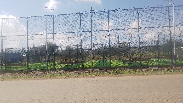 A large enclosed sports facility is seen from outside the perimeter fence. The fencing is made of wire mesh with metal supports. A row of green trees and plants is visible through the fence. The facility has lighting poles and a soccer goal. The foreground is a gray road. The sky is blue with some clouds.
