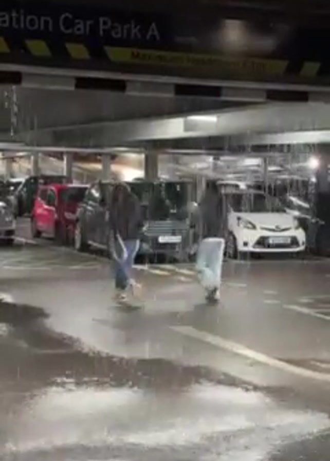 The video depicts two individuals walking through a flooded parking garage during heavy rain. The parking garage, labelled "Aviation Car Park A," has a sign indicating a maximum headroom of 2.1m. Cars of various colors are parked in rows, partially visible through the downpour. The ground is covered in puddles reflecting the overhead lighting and the rain itself. The two people, wearing dark jackets, are walking away from the camera and towards the parked cars.