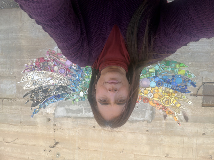 An adult female is centrally positioned in a close-up selfie against a light-colored concrete wall featuring a large, multi-component wing mural. The woman has medium brown, straight hair extending past her shoulders and wears a deep red high-neck top beneath a V-neck, dark purple ribbed knit sweater. She maintains a neutral expression, looking directly forward. The mural behind her depicts two stylized wings constructed from numerous small, repurposed plastic and electronic components. The left wing (viewer's left) prominently displays yellow, orange, blue, and green items, while the right wing (viewer's right) primarily features blue, black, white, silver, pink, and red components. The concrete wall is textured with horizontal lines and small dark indentations; a dark, rectangular opening or window is partially visible on the far left. The scene is illuminated by natural daylight. This location is within the Shaar HaNegev Regional Council, Israel.