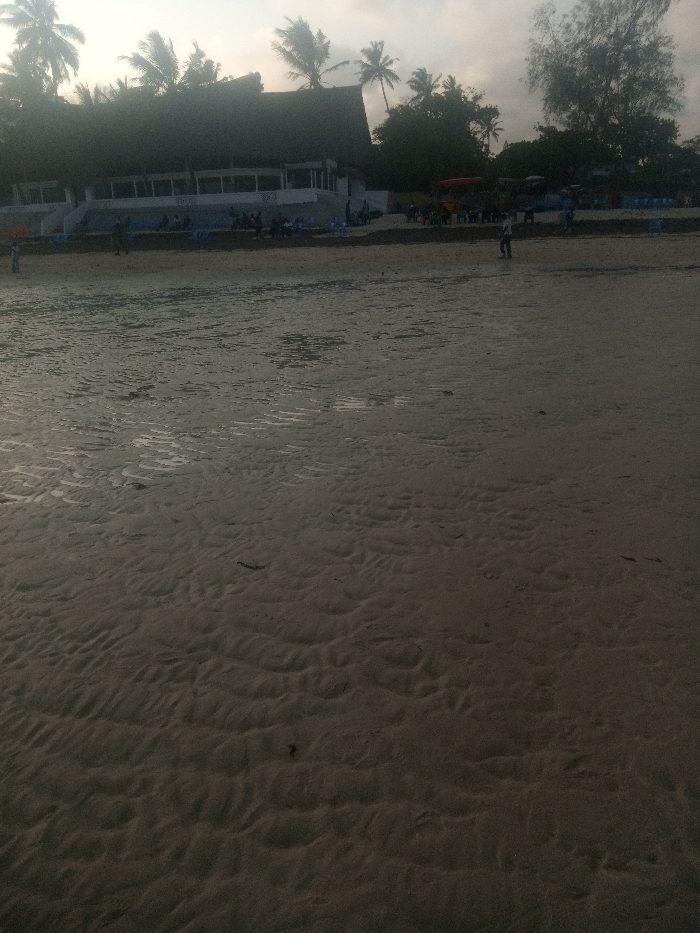 The image depicts a beach scene in Shanzu ward, Kenya, under overcast or low-light conditions, possibly dusk