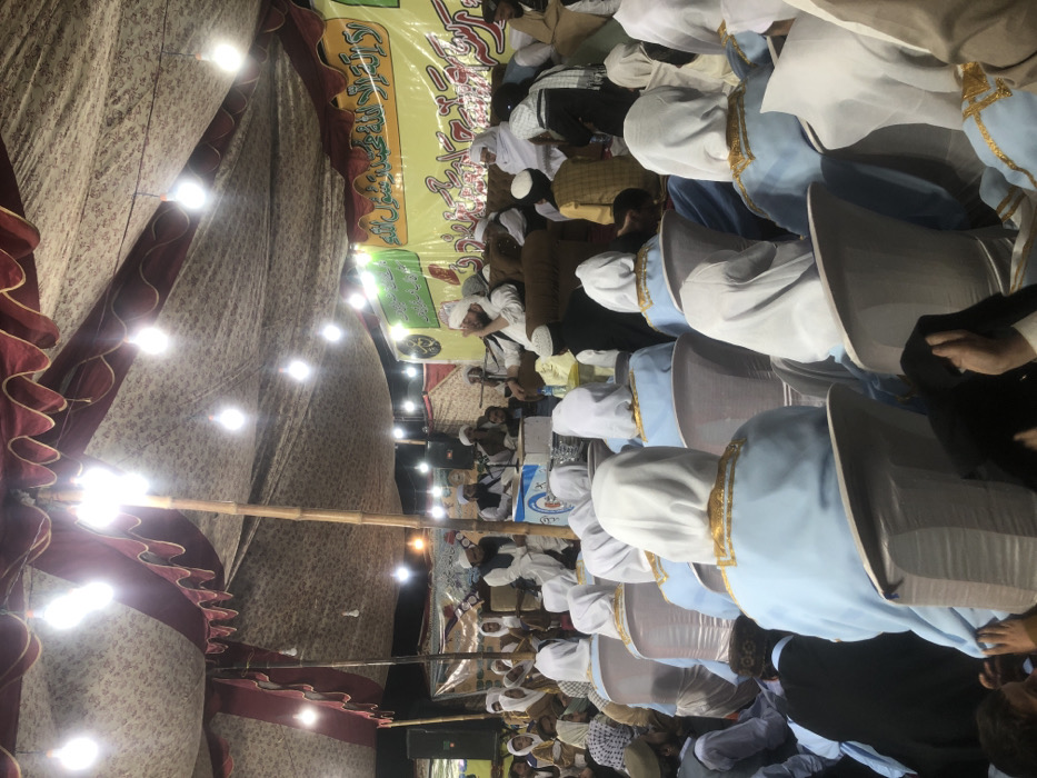 People are seated in rows under a tent, many wearing white and blue head coverings. A banner with Arabic text is visible in the background. The setting appears to be an indoor gathering, possibly religious or ceremonial, with an audience attentively listening. The lighting is dim, enhanced by numerous small bulbs strung along the tent's interior.