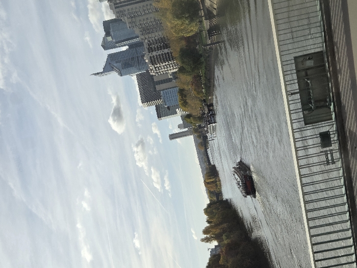 The image presents a tilted, wide view across the Seine River towards the skyline of La Défense in Courbevoie, France, under a partly cloudy sky. In the immediate foreground, a dark grey metal bridge railing, featuring numerous vertical bars and a horizontal top rail, extends across the lower portion of the frame. Below the railing, parallel shadows are cast onto an unseen surface, suggesting direct sunlight. The midground is dominated by the Seine River, flowing from the left background towards the right foreground. Its surface is rippled and reflects the sky, appearing dark grey-green. A multi-level, dark-hulled passenger boat or barge is observed moving from left to right across the river, generating a distinct wake behind it. On the river's right bank, several smaller white recreational boats are moored to docks. Both riverbanks are lined with dense foliage, displaying autumnal colors of yellow, orange, and green. The background reveals the dense urban landscape of La Défense. A cluster of modern skyscrapers with reflective glass facades rises prominently, including the distinctive angular top of a tall building, likely Tour First. Other commercial and residential buildings of varying heights are interspersed among the high-rises. Beyond these structures, the land continues with more distant buildings and trees. The sky is a light blue with scattered white cumulus clouds and multiple thin white contrails from aircraft. The overall lighting indicates a bright, sunny day. No individuals are distinctly visible.