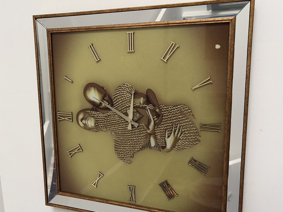 The image displays a square wall clock mounted on a plain white wall. The clock features a reflective mirrored outer frame, approximately 2-3 cm wide, surrounding a narrower golden inner frame. The clock face presents a gradient golden-bronze hue, lighter in the center and darkening towards the periphery. Central to the clock face are two three-dimensional metallic figures, rendered in a coppery-gold finish. The prominent figure, positioned on the left, depicts a stylized human bust with its head tilted slightly upward. Its body is composed of a textured, chainmail-like pattern that appears to fragment or dissipate around the neck and lower torso. Two smooth, stylized arms belonging to this figure emerge from its mid-torso, cradling a small, jagged crown-like object. A second stylized figure is positioned to the right, behind, and appears to be embracing the first. Its head is tilted downward, resting on the primary figure's right shoulder. This second figure has a smoother metallic finish on its head and arms, which wrap around the waist of the primary figure, with hands resting gently. Its body also exhibits the textured, chainmail-like pattern. Two metallic clock hands, one shorter (hour hand) and one longer (minute hand), emerge from the central chest area of the figures. They are positioned to indicate approximately 10:47. Twelve gold-colored Roman numerals serve as hour markers, scattered across the clock face in various orientations and non-traditional positions; some are tilted, and some are partially obscured by the central artwork. Reflections in the mirrored frame indicate an indoor setting, showing glimpses of a white ceiling and potentially a light fixture or vertical structure. No specific geographical landmarks or external features are discernible within the image that would allow for the identification of a precise location within Saint-Étienne, France.
