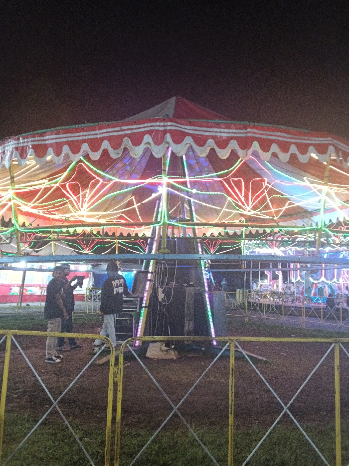A brightly lit carousel dominates the dark scene. It features a red and white striped canopy with festive lighting outlining its structure and creating decorative patterns beneath. Three individuals stand near the carousel's base, near a fence. The ground is a mix of grass and dirt. The overall atmosphere is festive and likely captured at night.