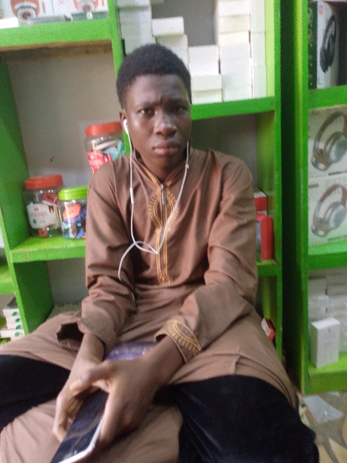 A young man sits cross-legged wearing a brown traditional robe with gold embroidery around the neckline and cuffs. He has earphones in and is holding a smartphone. He appears to be in a shop, with shelves stocked with items like jars of sweets, boxes, and headphones. The shelves are painted a bright green. He has a serious expression on his face. He is wearing black pants.
