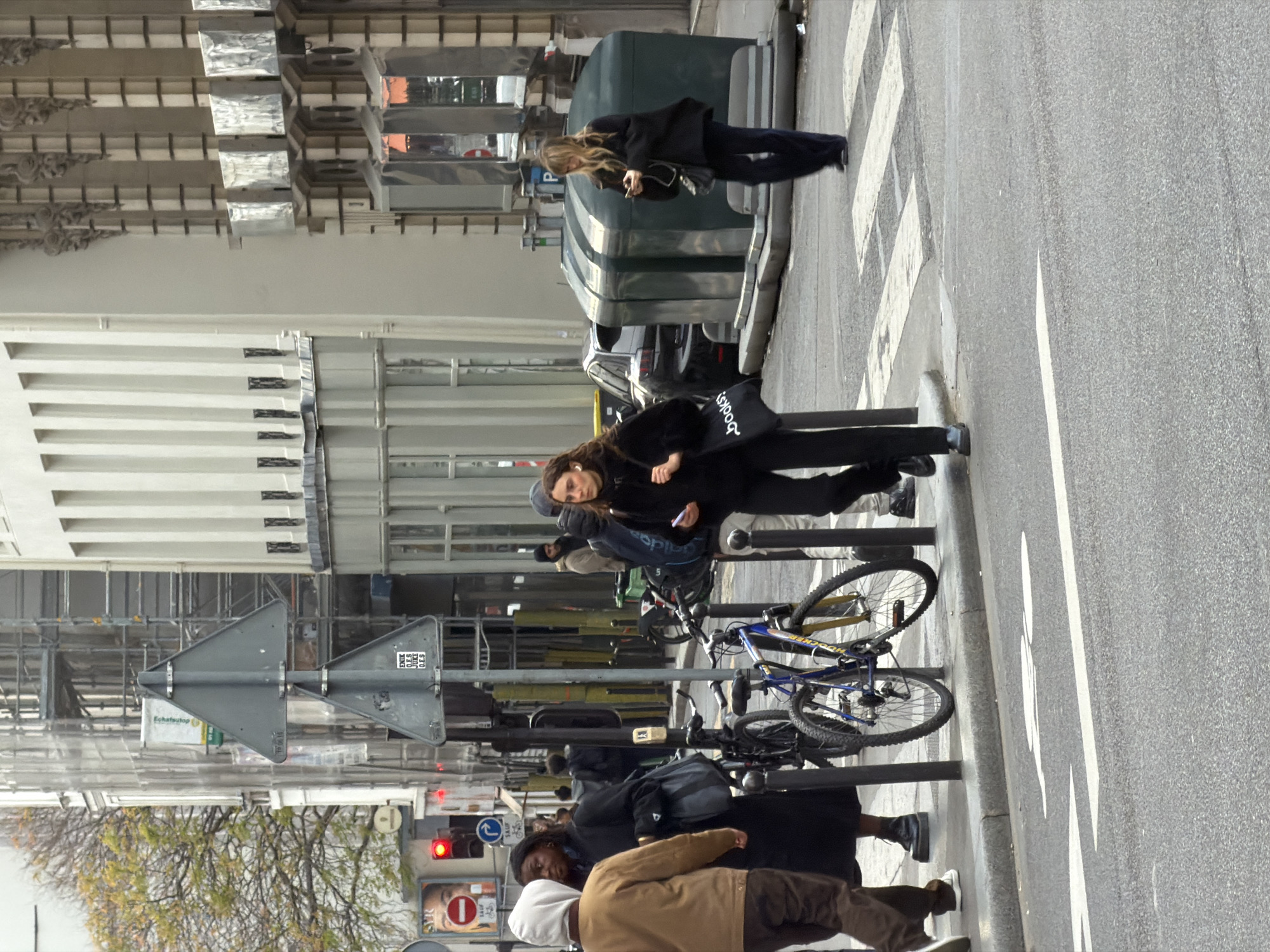 - "A street in Paris shows pedestrians, including two women on the sidewalk, one with long blonde hair in a dark jacket using a cell phone at a crosswalk" by FM-ilC4O2, licensed under CC BY 4.0