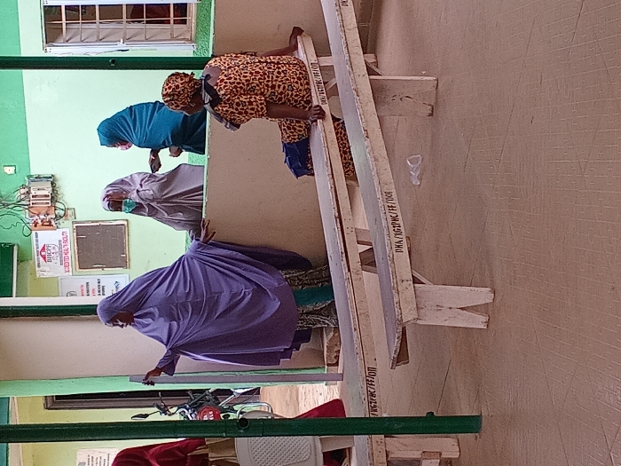 The image depicts an outdoor or semi-outdoor waiting area of a healthcare facility in Rigachikun, Nigeria