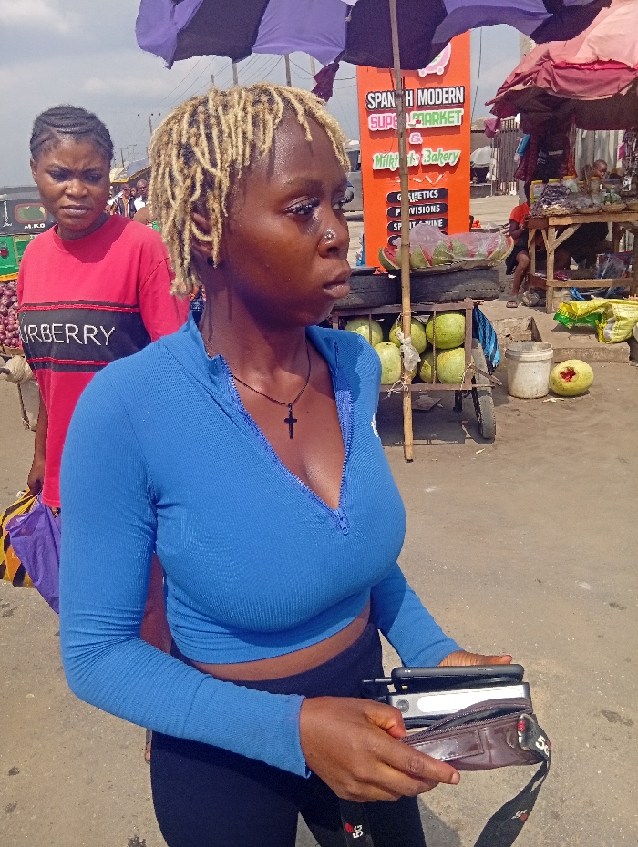 The scene depicts an outdoor market in Ura Nta Umuarandu, Nigeria, under bright daylight. In the foreground, a dark-skinned female with blonde dreadlocks and a nose piercing is seen from the chest up, facing right. She wears a blue, ribbed, long-sleeved crop top with a partial zipper and black leggings. A black necklace with a small black cross pendant is visible. Her right hand holds a black smartphone, a silver/white power bank or second phone, and a small, dark brown zippered pouch with a black strap marked "5G." Behind her, to the left, another dark-skinned female in a red t-shirt with "BURBERRY" text is partially visible, looking towards the camera. Adjacent to her is a cart with red onions. To the right of the primary subject, an orange vertical sign advertises "SPANISH MODERN SUPERMARKET," "MILKFOODS & BAKERY," "COSMETICS," "PROVISIONS," and "SPIRIT WINE." Below the sign, green watermelons or similar fruit are displayed on a stand. Further right, an additional market stall holds various goods, including dried items, with a white bucket and a partially consumed watermelon on the ground. Multiple purple and red market umbrellas provide shade. The ground appears to be dirt or an unpaved surface.
