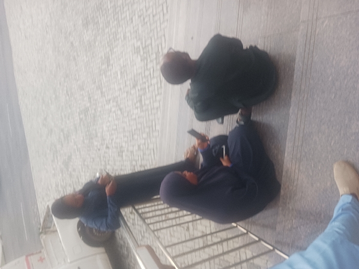 The scene depicts an outdoor urban environment in Lokoja, Nigeria. Three individuals are present on or immediately adjacent to gray concrete steps, beside a silver metal railing. One person, dressed in a dark long-sleeved top and dark full-length garment, stands leaning on the metal railing, actively viewing a smartphone. Below and to their right, a second person wearing a dark blue hijab and dark full-length garment is seated cross-legged on a gray step, also engaged with a smartphone. A third person, dressed in dark clothing, is seated further right on a lower gray step, facing largely away from the camera. In the bottom-left foreground, the lower leg and foot of a fourth individual, wearing light blue trousers and a light-colored shoe, are partially visible. Beyond the metal railing, a white pickup truck with a red cross emblem on its side is partially visible on a light-colored brick-paved surface, which then transitions into a darker asphalt road in the background. The scene is illuminated by diffuse daylight.