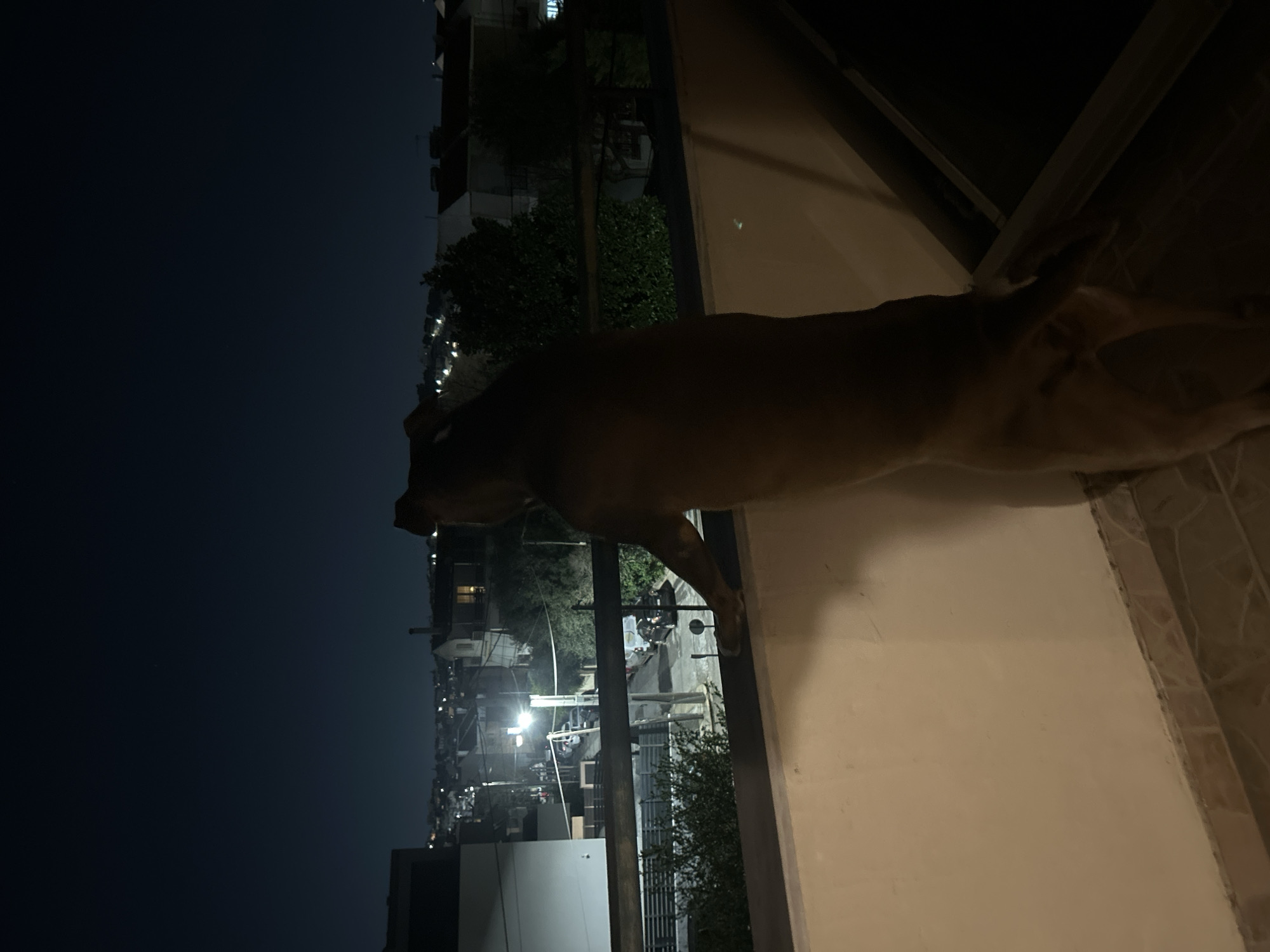 The image depicts a nighttime scene from a balcony in Gerakas Municipal Unit, Greece. A large, light-brown canine, viewed from behind, stands upright on its hind legs with its front paws resting on a dark metal balcony railing. The balcony floor consists of light-colored tiles, and the lower balcony wall is light cream. Beyond the railing, a residential street is visible below, partially illuminated by a bright streetlamp. Parked vehicles, including two white vans, line the street, accompanied by utility poles and overhead wires. Various multi-story residential buildings, some with light-colored facades, and dark green foliage are present in the urban landscape. The sky above is dark, indicating night, with distant lights marking the urban horizon.