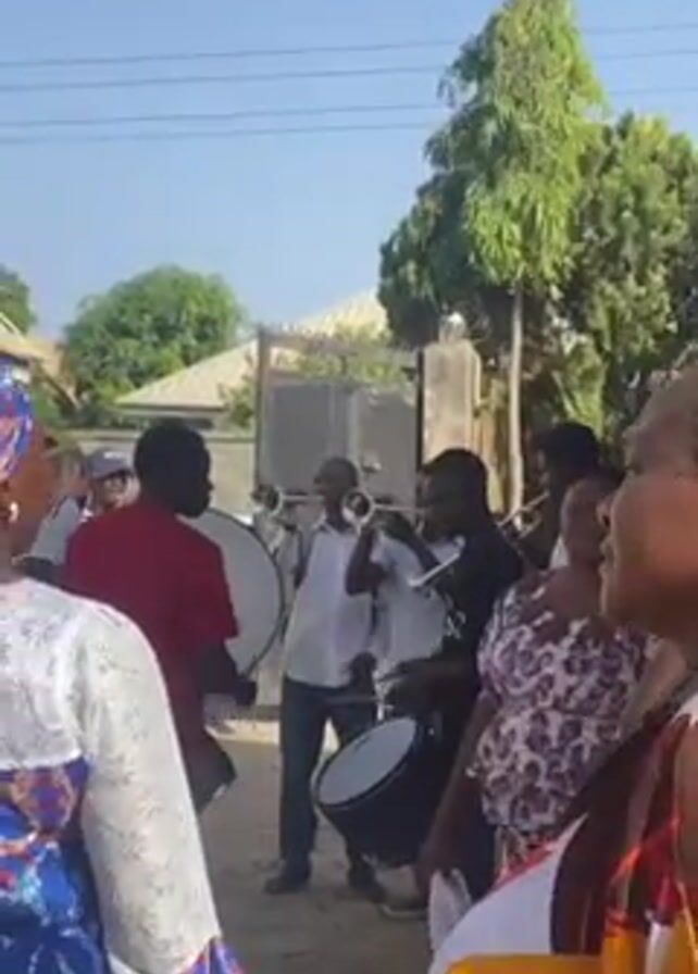 A group of people are celebrating with a brass band playing behind them in an outdoor setting, possibly a street or yard. The band includes musicians playing trumpets and drums. Most of the celebrating people are wearing brightly colored patterned clothing and headwraps. Some people are dancing. The background features buildings and trees. The day is bright and sunny.