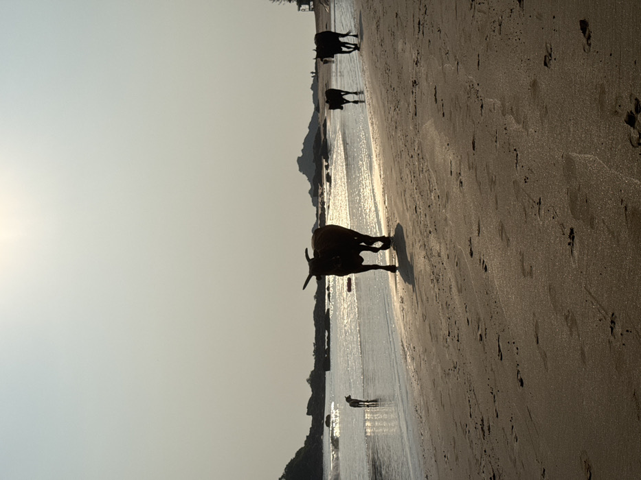 The image depicts a beach scene in Gokarna, India, under a bright, hazy sky with the sun creating significant glare on the water, indicating a backlit setting. In the immediate foreground, dark, wet sand shows numerous footprints. A large, dark-silhouetted bovine, likely a water buffalo or a large cattle breed with prominent horns, walks towards the viewer along the water's edge on the left side of the frame. Its shadow extends forward on the wet sand. Further along the shoreline, to the right of the prominent bovine, two additional dark-silhouetted bovines, smaller in size, are visible walking away from the viewer, appearing to follow the curve of the beach. On the far left, standing in the shallow water where small waves break, a light-colored dog is visible, facing left. The ocean occupies the mid-ground, with gentle waves breaking on the shore. The water reflects the bright sky, creating a shimmering effect. Several dark, rocky outcrops or small islands are scattered across the water in the mid-distance and along the distant shoreline. On the far right, near the water's edge, two small, indistinct human figures are visible, standing near what appears to be a dark, small structure or hut, partially obscured by a tree or foliage. The background consists of hazy hills or landmasses with rocky features.