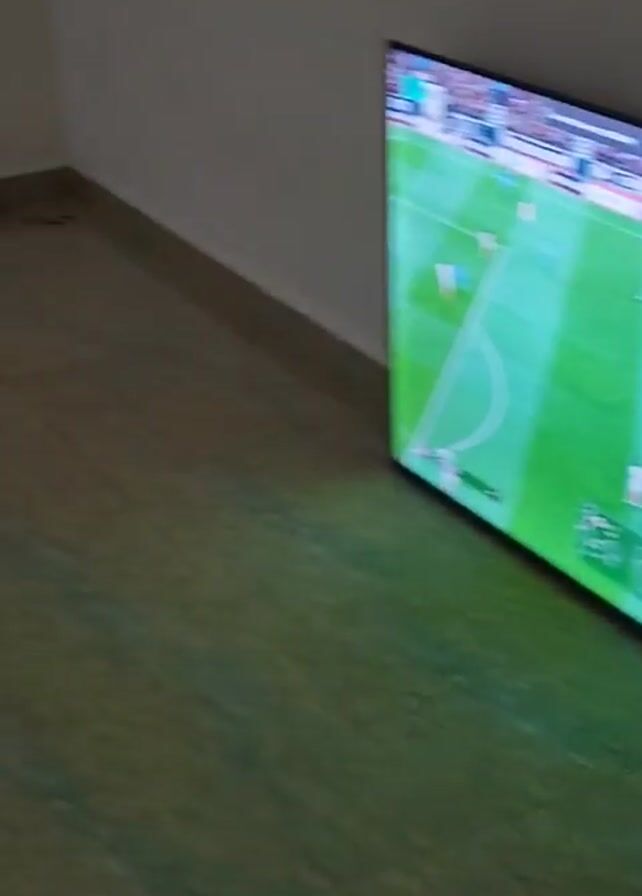 three young, shirtless men sitting in black plastic chairs, playing a soccer video game on a large TV. The TV is positioned on a tiled floor against a white wall. The game displays a green field with players in blue and white jerseys. The men appear focused on the game, with one holding a game controller. The room has neutral-colored walls and tiled floors.