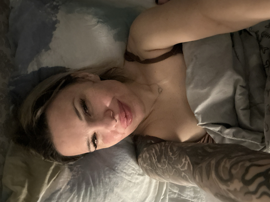 An adult female is depicted lying in a bed, appearing to take a selfie. She is positioned with her head on a light blue or grey pillow, partially covered by a light grey duvet or blanket with a faint pattern visible on the lower right corner. The subject has fair skin, full lips, a nose ring in her left nostril, and false eyelashes. Her hair, which appears to have blonde highlights, is pulled back. She is wearing a dark brown bra and a thin, gold-colored necklace with a small heart-shaped pendant. Her left arm, extensively covered in dark-inked tattoos, is visible in the foreground. Her gaze is directed towards the camera, and her expression suggests a slight smile. The lighting is dim, indicating an indoor setting, likely a bedroom. The specific location in Rostov-on-Don, Russia, cannot be visually confirmed from the provided image.