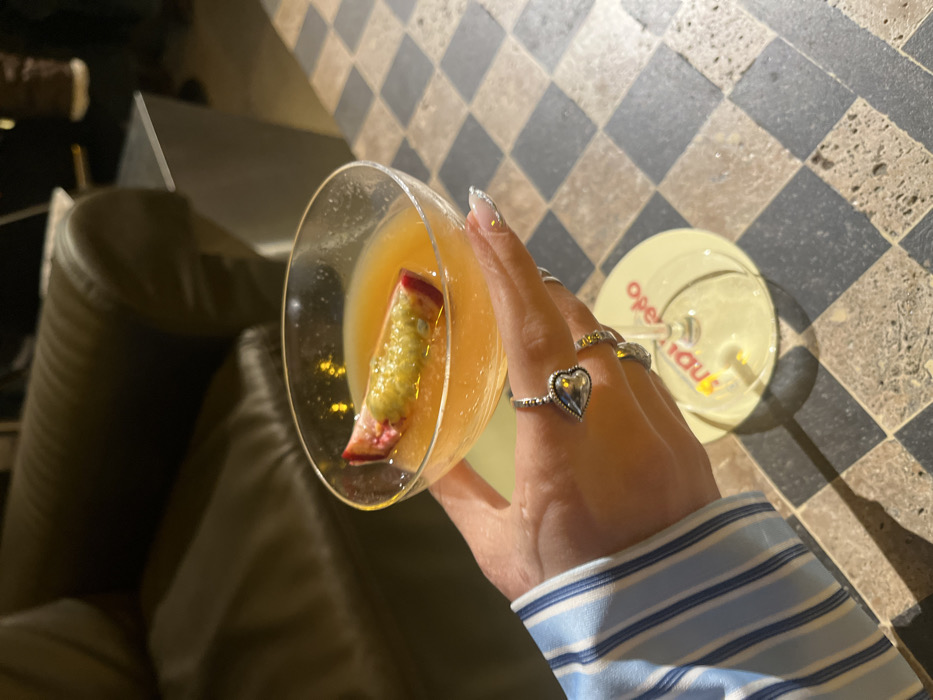 A human right hand, wearing a light blue and white striped sleeve, holds a coupe-style cocktail glass in an indoor venue in Yerevan, Armenia