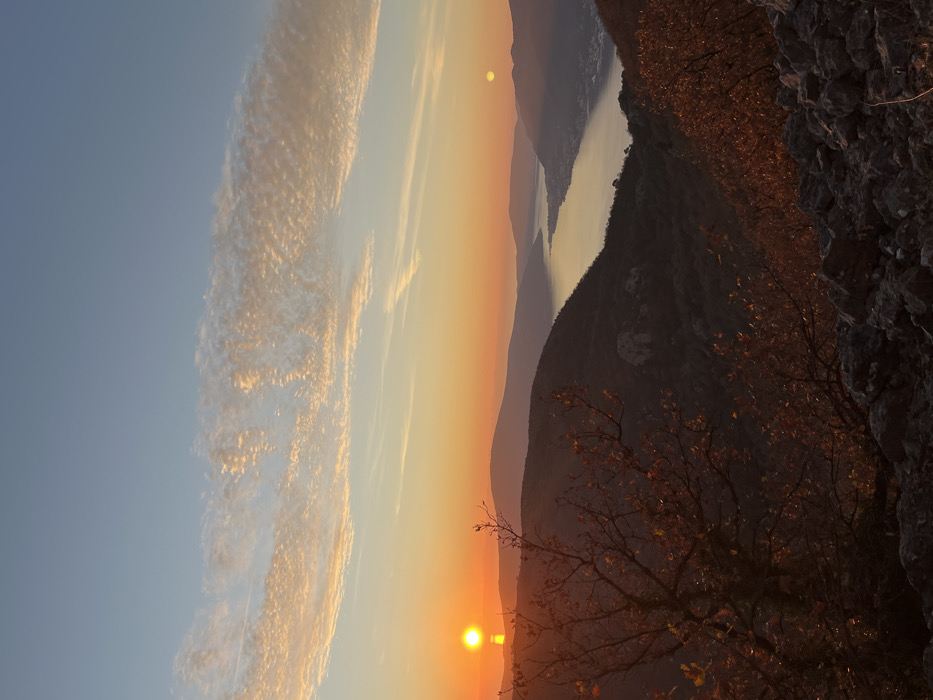 A landscape view captures a sunrise over a body of water nestled between mountains. The sky transitions from deep blue to orange, with textured clouds on the left. Two prominent suns appear, one near the horizon and another higher in the sky. Rocky terrain and trees with autumn-colored leaves frame the right side of the image. The composition is vertically oriented.