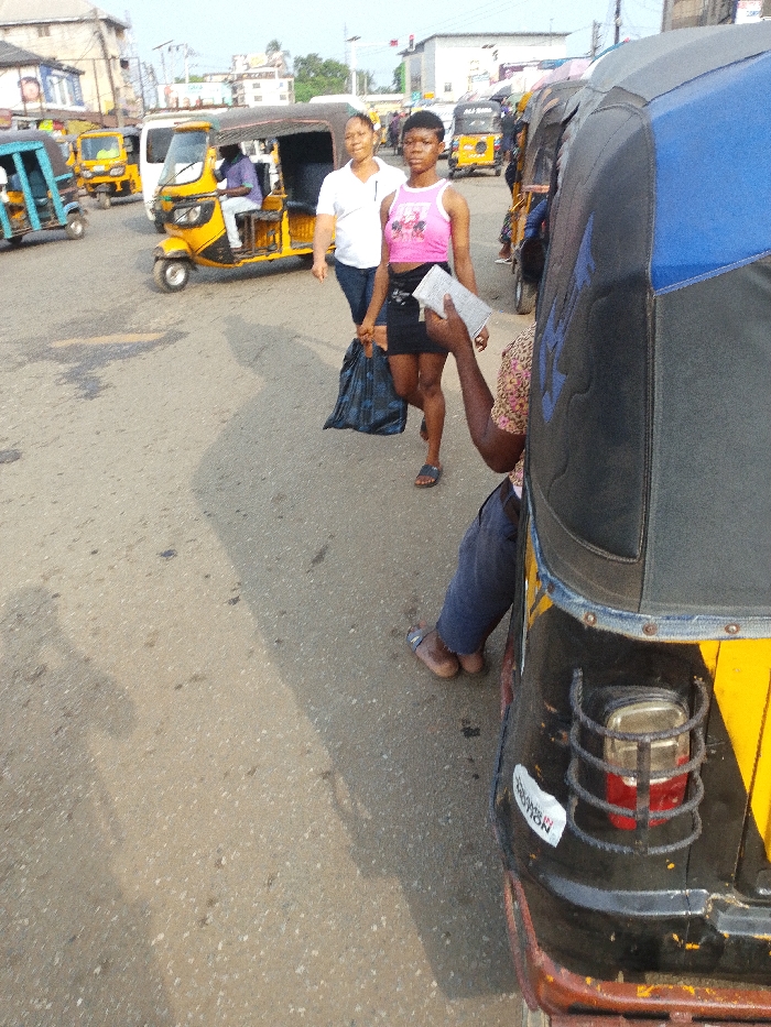 The image captures a daytime street scene in Nkpor, Nigeria, depicting vehicular and pedestrian activity on an asphalt road