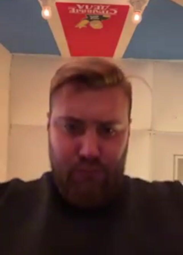 A man with light brown hair and a beard is facing the camera. He is wearing a black sweater. The camera is angled upwards. Behind him is a white ceiling made of square padded panels. There is a round vent in the ceiling. Above that is a decorative panel with a blue background and a red and white design with text that is upside down. Above the panel are four lights. The man moves his arms up and down a little.