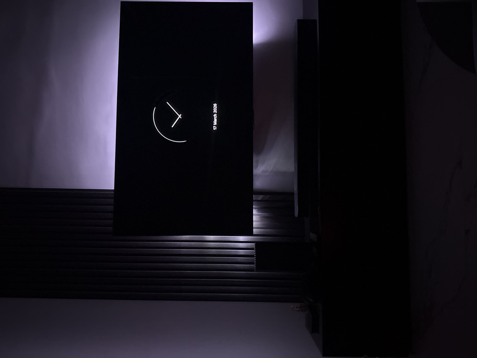 The image depicts an indoor scene in Latsia, Cyprus, characterized by low light with a predominant purple-pink ambient illumination. A large, dark-screened television is centrally positioned, displaying a white minimalist digital clock face with hands and the text "17 March 2026." Directly beneath the television is a dark soundbar. Below the soundbar, a large, dark, rectangular media console or cabinet spans the width of the lower frame. To the left of the television, a vertical wall section is covered with dark, ridged or slatted panels, extending from the bottom of the television upwards. The wall behind the television and slatted panel is light-colored and glows with the purple-pink light, suggesting a hidden light source. The floor in the foreground is a light-colored surface, possibly polished stone or marble, exhibiting subtle patterns. No individuals, actions, or direct interactions are depicted.