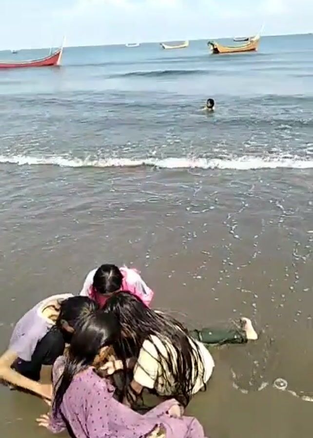 five young girls on a sandy beach near a gentle surf. Four of them are clustered close together, seeming to be inspecting something on the sand. They are all wearing modest clothing with long sleeves. The fifth girl is further away, swimming in the ocean. Several small fishing boats are visible on the water under a clear, blue sky with a few wispy clouds. The video is shot from a low angle and seems to be handheld, with slight camera shake.