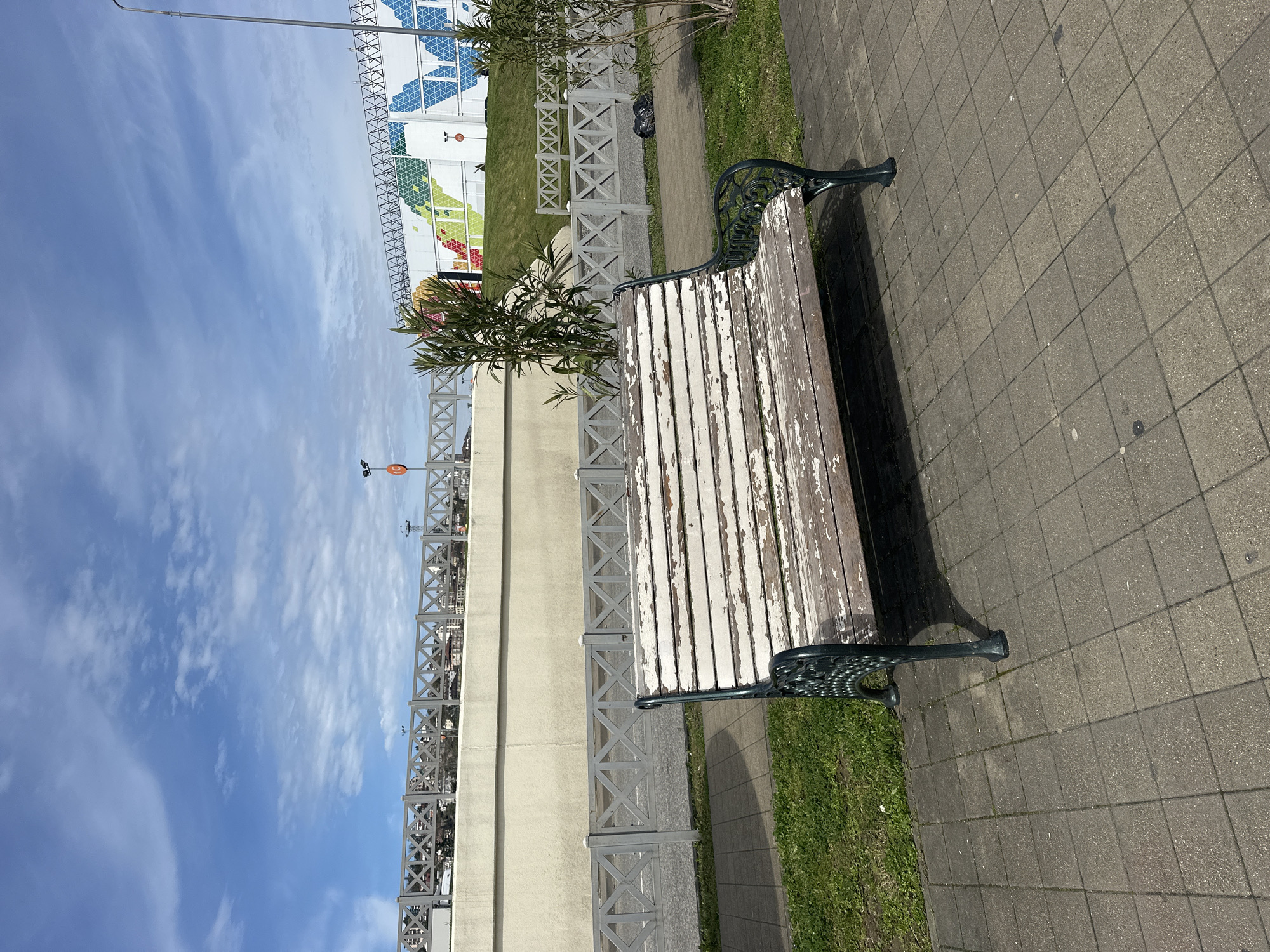 weathered park bench situated on a paved walkway in Sochi, Russia. The bench features a wooden plank seat with peeling white paint and decorative dark green metal armrests and legs. It sits adjacent to a low, grey concrete wall with a decorative cross-lattice design, which separates the walkway from a grassy area. Beyond the wall, a larger structure with a mural depicting various scenes or figures is visible. The sky above is bright blue with scattered clouds. The walkway is made of grey square tiles. The scene appears to be a public area, possibly a park or promenade in Sochi. There are no people visible in the frame.