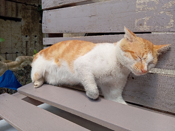 - "An orange and white cat is depicted resting on its back on a weathered wooden bench in Baron, Indonesia" by FM-TnUEx2, licensed under CC BY 4.0
