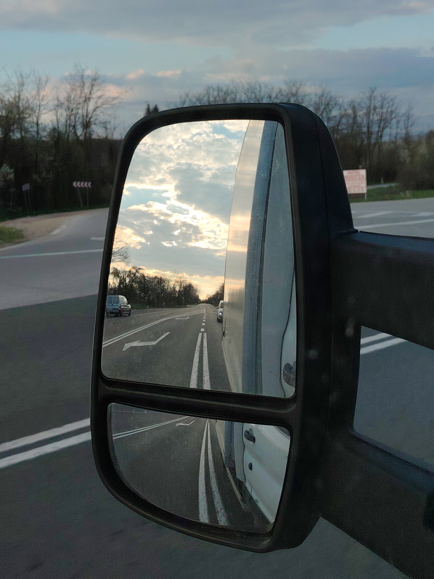 A side view mirror of a van captures a road scene at dusk. The mirror reflects a road stretching into the distance with a white van partially visible alongside, in the mirror. Beyond the mirror, the road forks to the left with directional arrows painted on the asphalt. Sparse trees line the roadside. In the distance, a sign appears to read "MOTEL." The location is Bogatovo, Bulgaria.