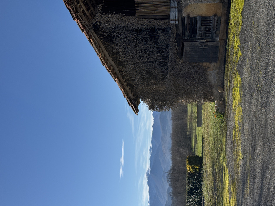 The image displays a rural landscape in Ponlat-Taillebourg, France, under a clear, bright blue sky with a single wispy white cloud on the left horizon. In the immediate foreground, a dark grey gravel surface is partially covered by patches of bright green moss or lichen. To the right, the weathered stone and stucco facade of an old building, likely a barn, is extensively covered by a dense network of dry, leafless vines. The building features a sloping roof with reddish-brown terracotta tiles and exposed wooden beams beneath the eaves. At the building's base, a dark wooden door with metallic hardware is visible, alongside an adjacent opening revealing vertical wooden slats within a shadowed interior. A small cluster of orange flowers grows on the grass near the building's foundation. To the left of the building, a vibrant green field stretches towards the mid-ground, bordered by a well-maintained dark green hedge that includes a distinct rectangular section of bright yellow foliage. Further in the background, a line of bare deciduous trees precedes a range of mountains, whose peaks are distinctly snow-capped under the distant blue haze. A concrete or stone trough is visible in the field behind the hedge. The scene is devoid of any human or animal presence or activity.