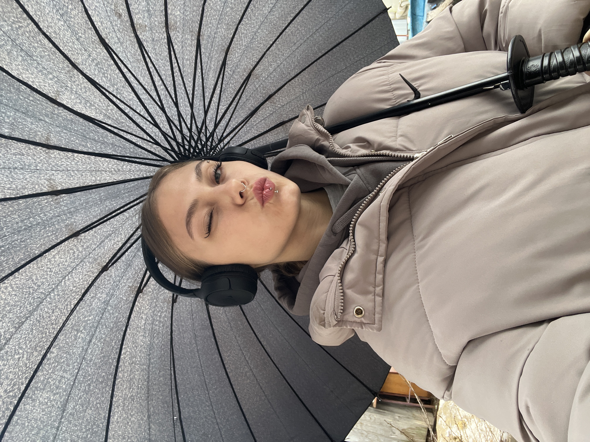 - "A young woman stands under an open black umbrella, wearing black headphones and a light beige puffer jacket over a gray hoodie" by FM-jM6EG3, licensed under CC BY 4.0