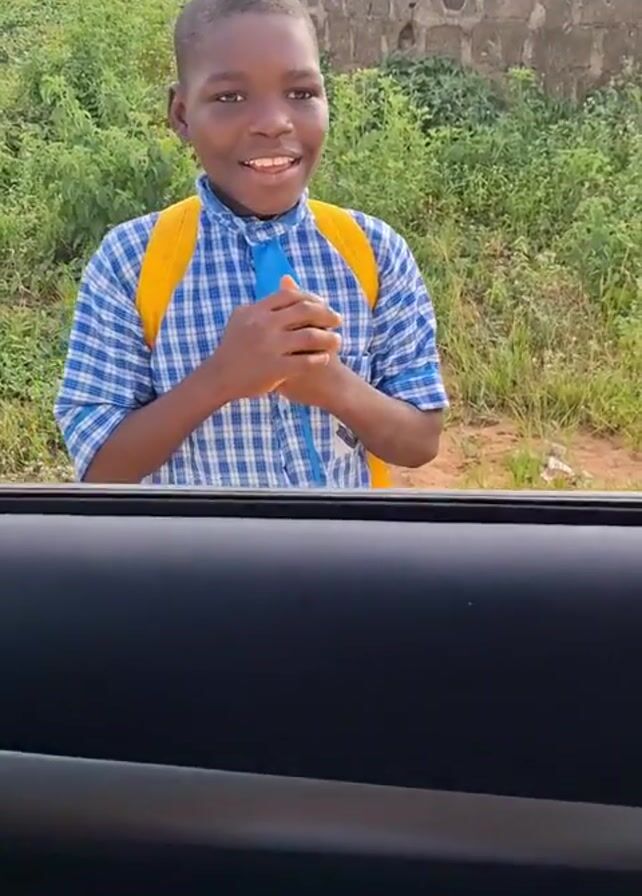 A young boy stands near a car, visible through the open window. He is wearing a blue and white plaid shirt, a blue tie, and a yellow backpack. His hands are clasped in front of him. He looks towards the left with a slight smile. The background shows a grassy area with a low concrete wall and some buildings in the distance. The car door is visible in the foreground, obscuring part of the scene.