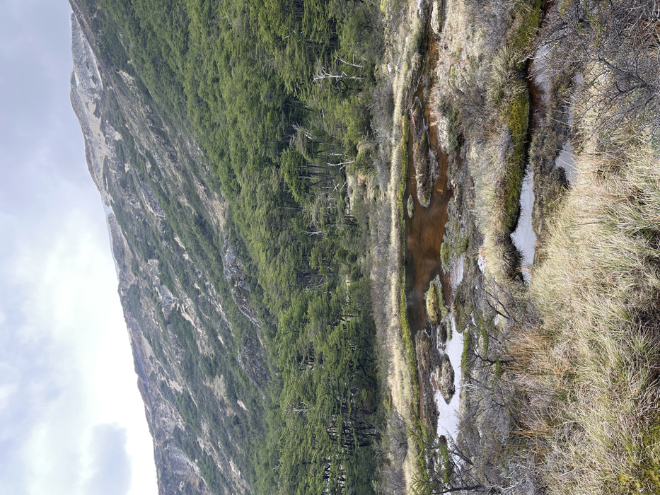 A rugged mountainside covered in dense green forest rises sharply. Adjacent to the forest is a marshy area featuring small pools of water and thick grasses. The sky is overcast and gray, suggesting a cool or potentially rainy climate. The terrain transitions from steep, rocky slopes to a more flat and vegetated wetland.