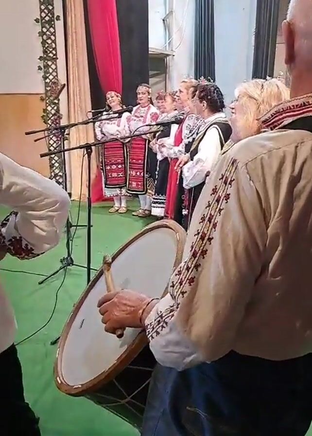 Behind the scenes footage shows a group of people in traditional embroidered clothing preparing for a performance. Six women stand in a line on a green stage, each in front of a microphone. A man in an embroidered shirt stands to the right, holding a drum. Another man stands to the left, also in an embroidered shirt, wearing a harness. Red and black curtains hang in the background. A decorative trellis stands on the left. The men appear to be part of the musical accompaniment for the women singers. The lighting is bright.