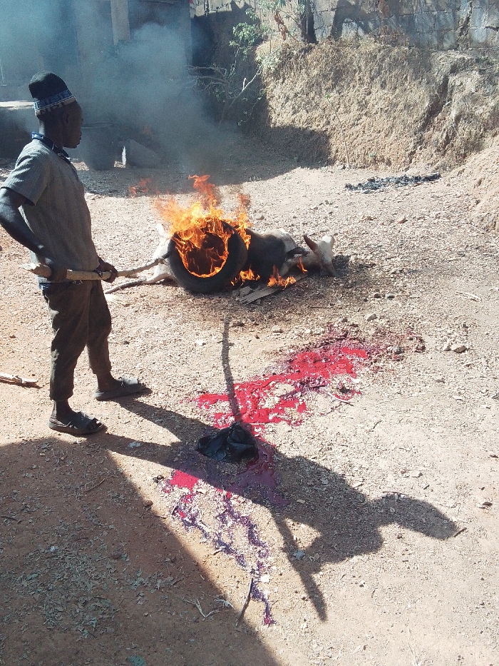 The scene depicts an outdoor location in Jos, Nigeria, under direct sunlight, casting sharp shadows. In the foreground, a dark-skinned male individual, wearing a patterned dark blue cap, grey short-sleeved shirt, dark trousers, and dark sandals, stands with his left hand on his hip. He holds a large, metal-bladed tool, possibly a machete or knife with a wooden handle, in his right hand, angled downwards. His gaze is directed towards the center-right of the frame. Adjacent to the individual's position, a large, irregular puddle of fresh, dark red blood is visible on the light brown, dusty ground. A dark, possibly black, piece of fabric or object and a slender stick lie partially submerged within the blood. In the midground, a deceased quadrupedal animal, appearing to be a goat or small cattle, lies on its left side. A black car tire is positioned around the midsection of the animal, which is actively engulfed in bright orange flames and producing black smoke. This indicates a scorching process. The background features a steep, textured earthen embankment or wall. Sparse green vegetation grows on the embankment, and patches of dark ash are visible on the ground near its base, suggesting previous fires. Structures are faintly visible in the far left background.