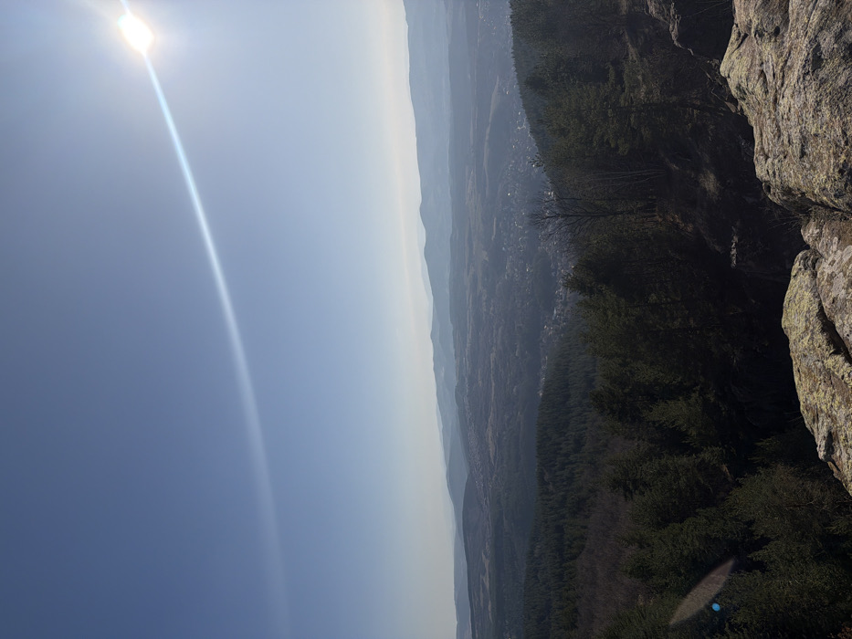A panoramic daytime view from an elevated, rocky vantage point overlooks the town of Kladnitsa, Bulgaria. In the immediate foreground, large, irregular rock formations covered in light green and grey lichen are visible. Below these rocks, a dense forest primarily composed of dark green coniferous trees and some bare deciduous trees slopes steeply downwards. Nestled within the valley and surrounded by further forested hills, the town of Kladnitsa is discernible, featuring numerous buildings with varied roofs and urban infrastructure. Beyond the town, successive layers of mountains extend into the distant horizon, appearing progressively lighter and bluer due to atmospheric haze, with some distant peaks showing subtle indications of snow. The sky above is clear and bright blue, occupied by an intensely bright sun in the upper right quadrant that emits a prominent diagonal lens flare across the frame. No people or overt actions are depicted.