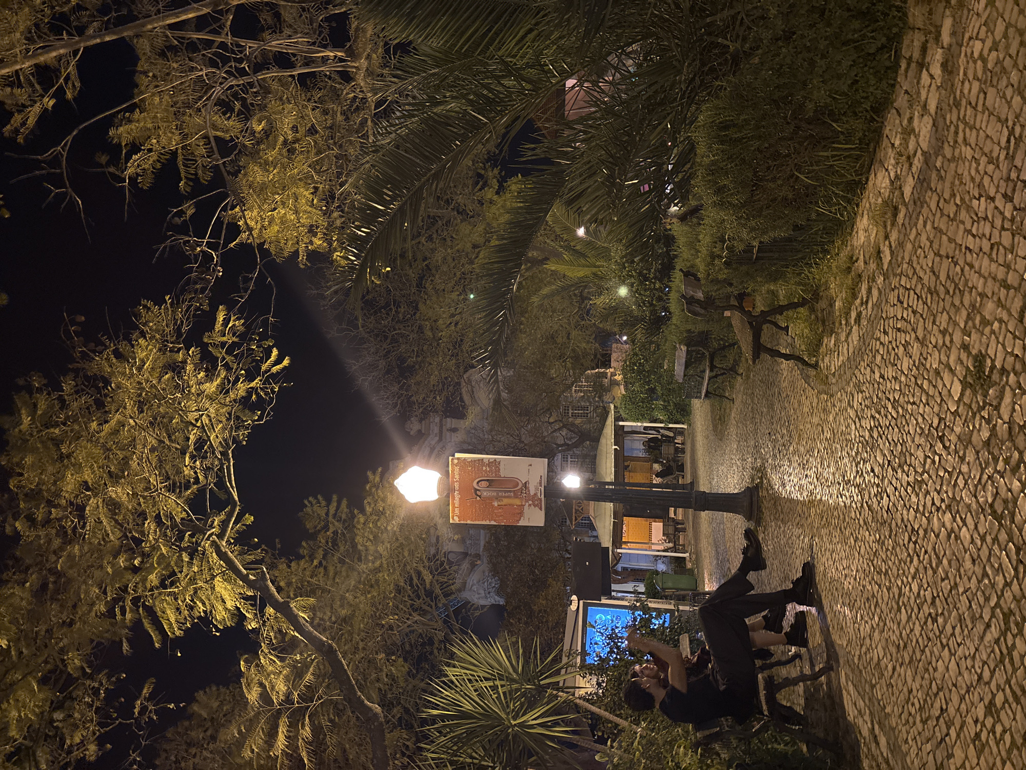 A nighttime view of a cobblestone-paved path bordered by trees and foliage in Lisbon, Portugal. The path is illuminated by a street lamp in the foreground, with a sign advertising "Super Bock" beer affixed to it. Two people are seated on a bench near the lamp, one seemingly using a smartphone or electronic device. Further down the path, tables and chairs are visible outside of a building, suggesting a restaurant or bar setting.