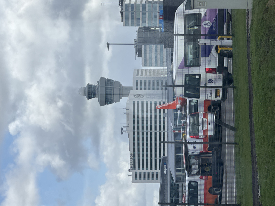 The image depicts an outdoor, partly cloudy daytime scene at Amsterdam Airport Schiphol, Netherlands
