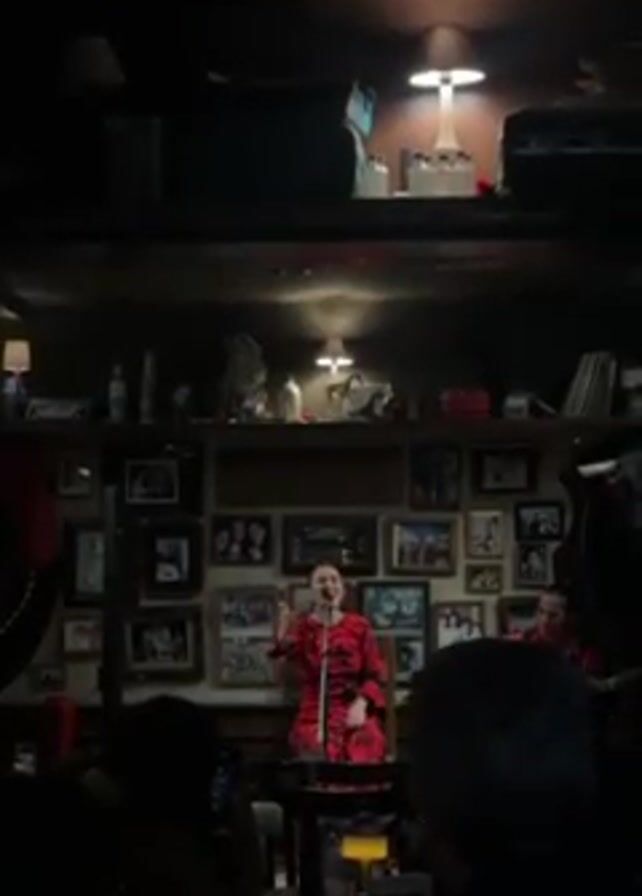 A dimly lit bar features a woman in a red dress singing into a microphone at a small table