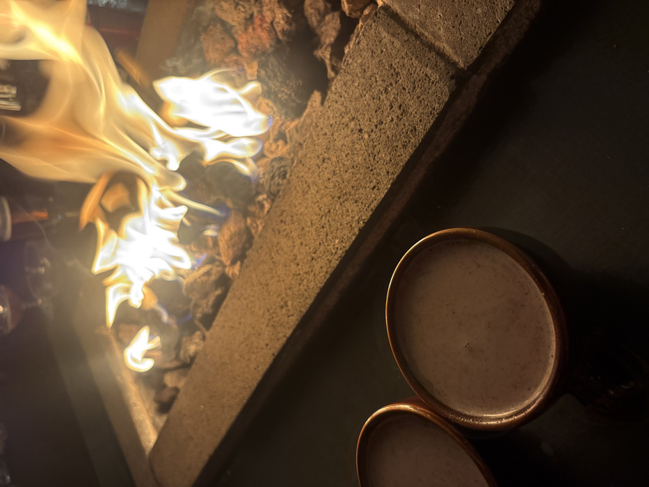 The scene is set in the city of Domingo Arenas, Mexico, under low-light conditions, likely evening. The image focuses on a rectangular fire pit with active flames, positioned diagonally from the upper right to the middle of the frame. The fire pit is constructed with a dark, textured border, possibly concrete or stone, and contains numerous dark, irregular rocks from which bright yellow-orange flames with blue bases emerge. In the lower left quadrant, two circular, brown-rimmed cups are present, each containing a light brown, frothy beverage, resting on a dark, flat surface. The blurred background reveals several stemmed glasses, including at least two containing an amber-colored liquid, consistent with a social or dining environment. No individuals are directly visible.