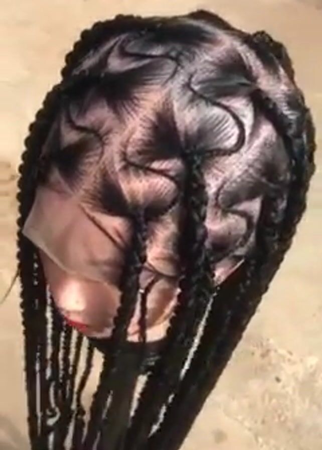 wig on a mannequin head. The wig has a cornrow style at the crown. The cornrows have a curved and zig-zagging design. The braids are long and black. The mannequin has a pink complexion and red lips. The wig is set on a black metal stand. The setting appears to be outdoors on a concrete surface. The camera angle rotates around the wig to provide a full view of the hairstyle.