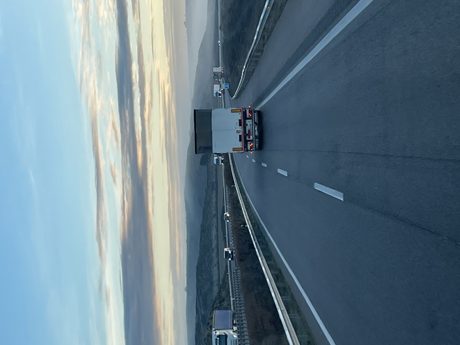 A highway view features a large white truck in the right lane, followed by other vehicles in the distance. The asphalt is marked with white lane dividers. A metal guardrail lines the side of the road. In the distance, hazy mountains meet a sky streaked with pale blue, gray, and hints of sunset colors. The scene is captured from a slightly elevated angle, possibly from within a moving vehicle.