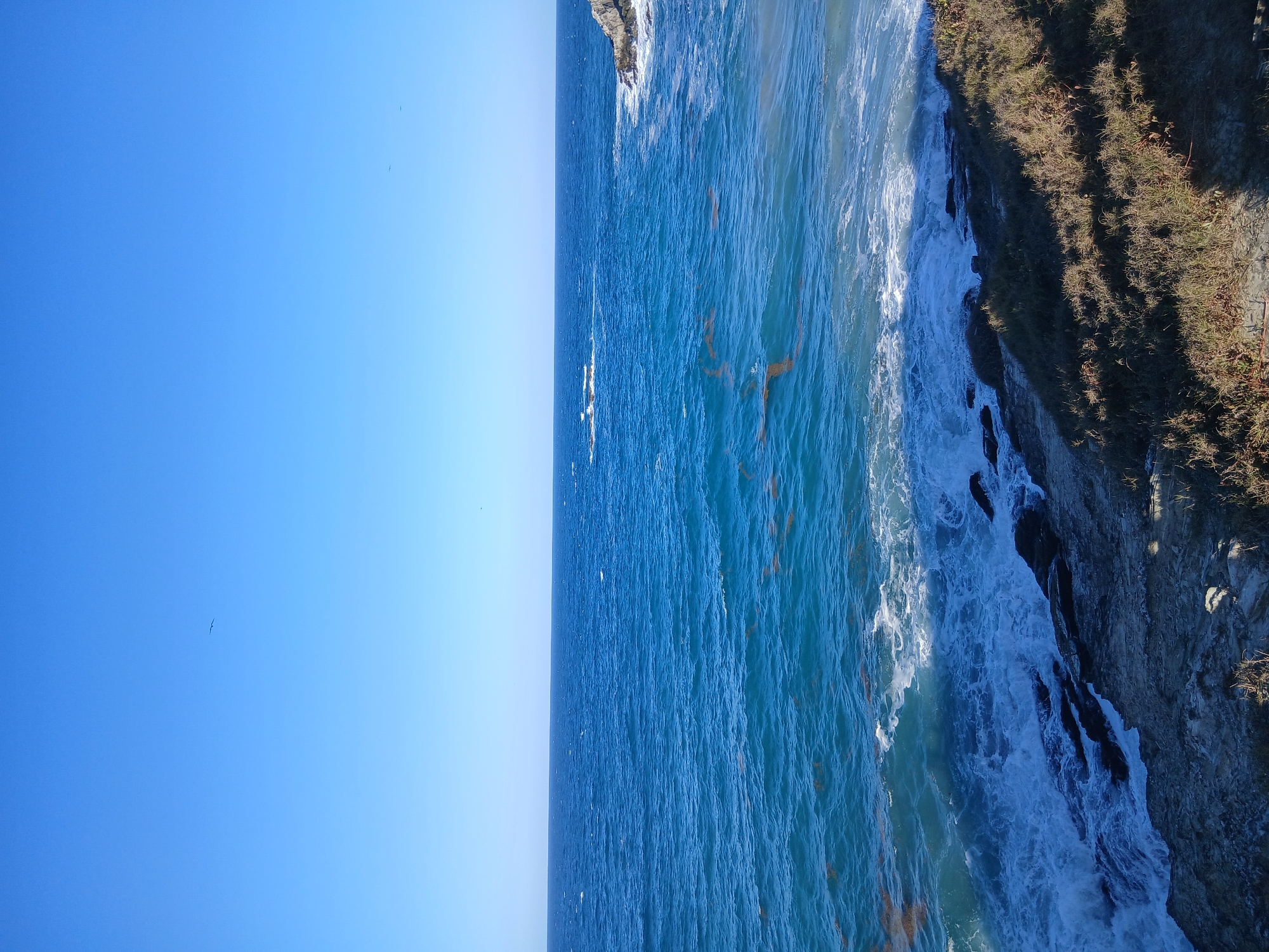 coastal scene in Playa Parguito, Venezuela. The sky is clear blue. The ocean, which occupies a significant portion of the frame, transitions from a deep blue further out to a lighter turquoise near the shore. There are visible waves crashing against the rocky coastline. A cliff covered in vegetation borders the water's edge.