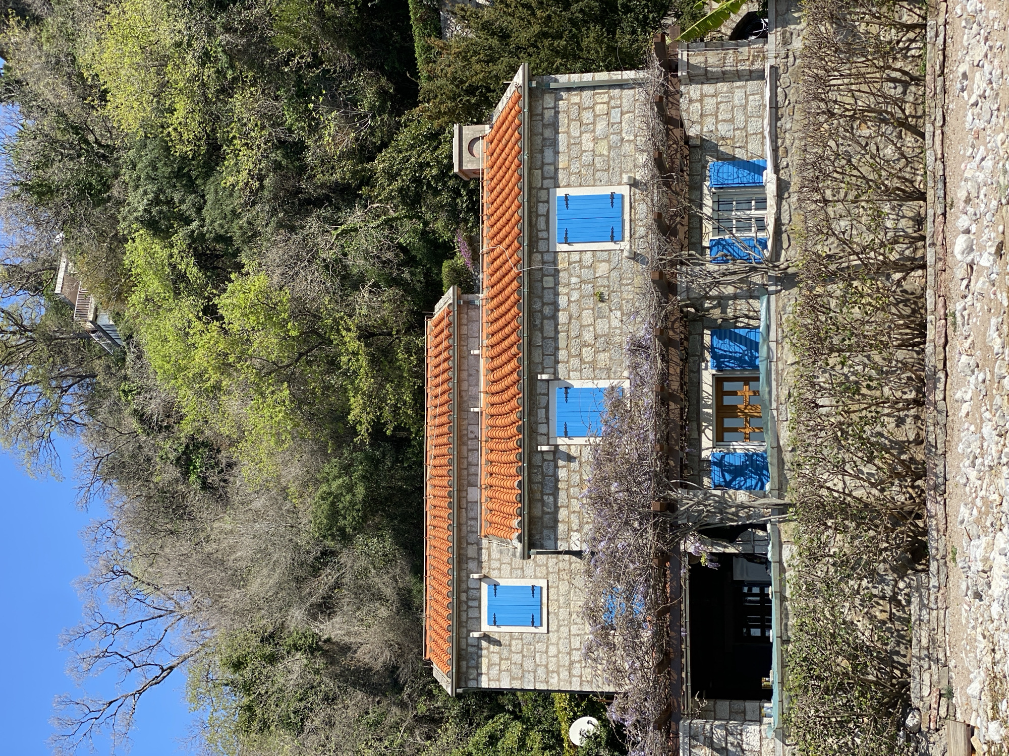 The image depicts a stone building with an orange tile roof, located in Mirište, Montenegro. The building has blue shutters on its windows. Wisteria vines are growing on the exterior of the building. Adjacent to the building is a trimmed hedge along a stone walkway or path. The surrounding environment includes trees with green foliage and others with bare branches against a clear blue sky.